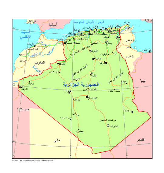 الموقع : تقع في شمال القارة الأفريقية يحدها من الشمال البحر الأبيض المتوسط وتحدها غربا المغرب و موريتانيا وجنوباً مالي والنيجر وشرقاً تونس وليبيا